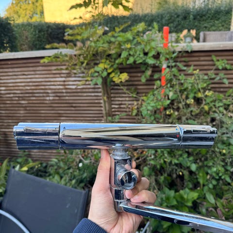 Termostatisk blandingsbatteri i krom med tilhørende fittings og vægbeslag. Anvendes til styring af vandtemperatur og flow i brusebad eller badekar.