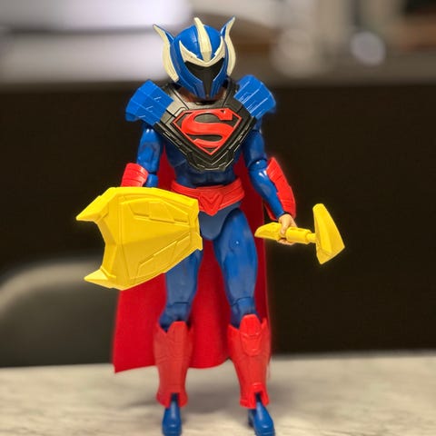 Denne actionfigur forestiller Superman, en populær superhelt fra tegneserierne. Figuren er cirka 30 cm høj og har de karakteristiske røde og blå farver, som Superman er kendt for. Den har en rød kappe med et gul Superman-symbol. Figurerne er lavet af plast og har en robust konstruktion, egnet til leg eller samling.