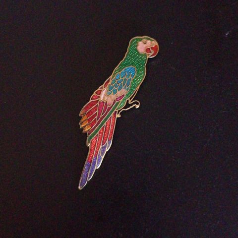 Denne genstand er en dekorativ broche formet som en fugl. Brochen er 5 cm i længden og er i farverne rød, gylden og sølv. Forsiden af fuglen er dækket med små glitrende sten, og der er en grøn sten der repræsenterer øjet. Brochen har en spids næb og detaljerede fjer, der er fremhævet i en gylden farve. Bagsiden af brochen fremviser en nålelukning, der gør det muligt at fastgøre brochen til beklædningsgenstande.
