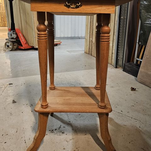 Lille sybord af syret eg. Flettet garnkurv og skuffe i front. Topplade 60 x 40 cm. Sideklapper B. 22 cm.