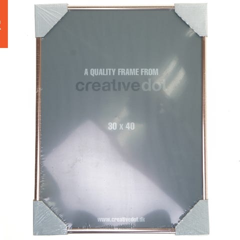 Dette er en kvalitetsbillederamme fra Creative Dot med en størrelse på 30x40 cm. Rammen er indpakket og har beskyttelsesmateriale på hjørnerne. Billedet viser at rammen har beslag på bagsiden til ophængning. Den er designet til at beskytte og vise dine fotos eller plakater på en stilfuld måde.