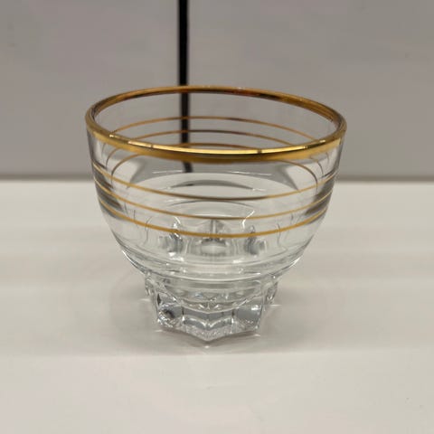 Sæt af otte drikkeglas lavet af klart glas med guldkant foroven. Glasene har en højde på ca. 4 cm og en diameter på ca. 4,5 cm, og er velegnede til servering af mindre drikkevarer eller som dekorative elementer ved borddækning.