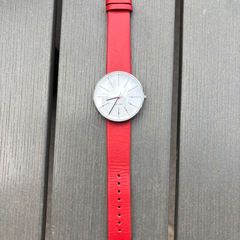 Dette er et ur fra Arne Jacobsen, som kommer med en elegant sort læderrem og en minimalistisk urskive i metal med røde accenter. Uret fremhæver klassisk dansk design. Pakningen inkluderer original emballage og kvittering.