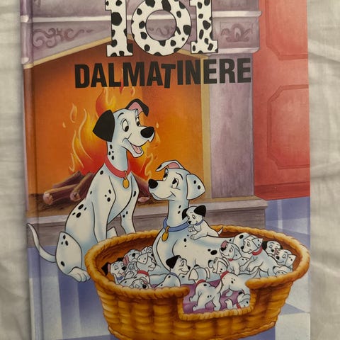En børnebog med titlen '101 Dalmatinere' udgivet af Walt Disney. Forsiden viser dalmatinerhunde foran en pejs. Bogen indeholder illustreret tekst om Cruella De Vil og dalmatinerhvalpene, med spændende eventyr og udfordringer. Bagsiden har en kort synopsis. Bogen er en del af Anders And bogklubben.