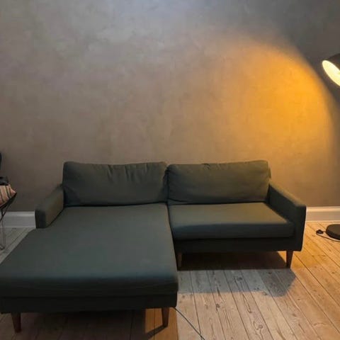 Green velour sofa for 3/4 persons, with chaiselong with storage. Can turn into a bed very easily. Very comfy!! Original price 8000dkk from Maison du Monde. Selling because we're moving out 💔 It has a small desperfect on the storage unit but it doesnt affect its functionality. Measurements: 240x90 (chaiselong 150)