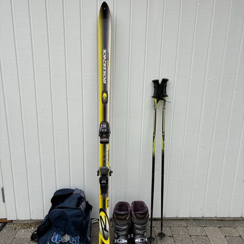 Ski, skistøvler og stave. Det er 10-12 år gammelt og er brugt omkring 15 gange.