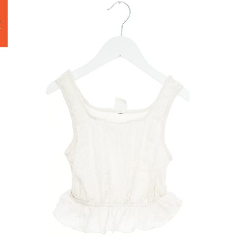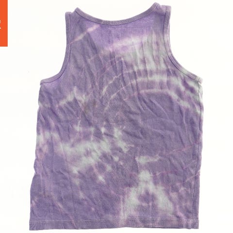 Sommertop i lilla farve med en asymmetrisk design og rynkede flæser. Den har én skulderstrop og elastik i kanten.