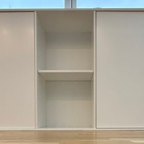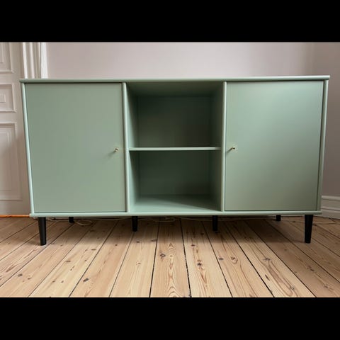Kan vægmonteres. Der er 1 hylde bag hver låge. Hylder kan fjernes/flyttes.