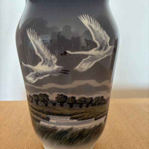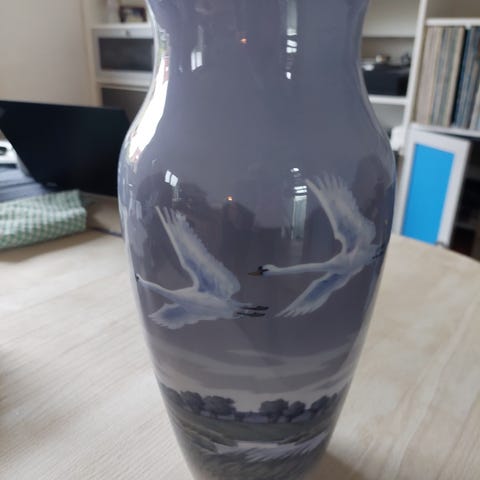 Royal Copenhagen vase med fuglemotiv i blå og hvide nuancer. Vasen har en rund form og er dekoreret med flyvende fugle over et landskab. Materialet er porcelæn.