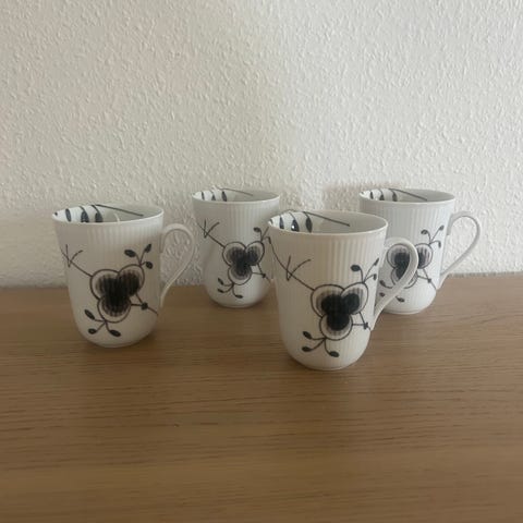 Royal Copenhagen kopper med sort blomstermønster. Fremstillet i porcelæn med klassisk blå dekoration. Velegnet til servering af varme drikke.