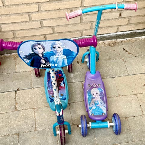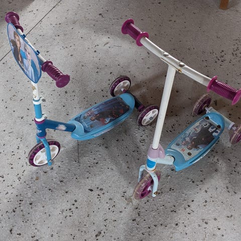 Disney Frozen løbehjul med tre hjul, designet til børn. Løbehjulene har motiver fra filmen Frozen og er i farverne blå og lilla. Materialet er primært plastik o