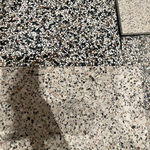 Terrazzo fliser i grå nuancer med dimensionerne 40x40cm. 15 mm tykke. Der er 19 stk. fejlkøb. Dvs. 3 m2 i alt. Fliserne har en poleret overflade med synlige små sten i materialet, hvilket giver et karakteristisk udseende. Velegnet til gulv- og vægbelægning.
