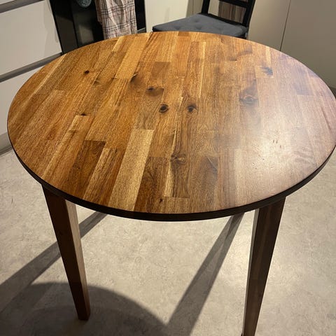 Super fint køkkenmøbel i massiv træ. Bordpladen kan derfor slibes ved behov.