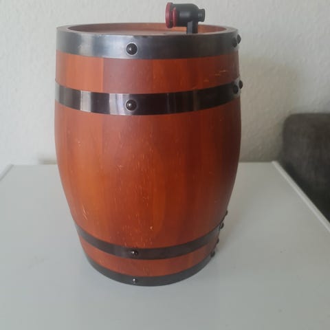 Et fad af massivt egetræ, 10L, 350 kr. - er helt tæt (laveten følger ikke med).