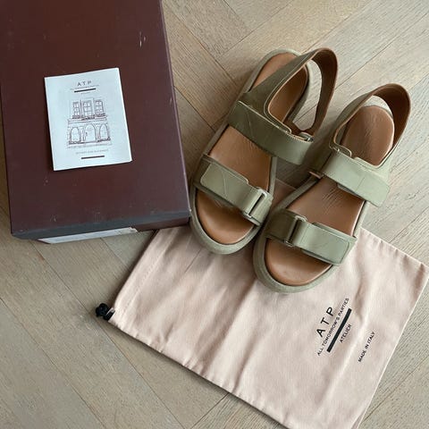 ATP Atelier sandaler i størrelse 36, lavet i hvidt læder. Sandalerne har en åben design med krydsede stropper og en flad sål. De egner sig til daglig brug og er velegnede til varme vejrforhold.