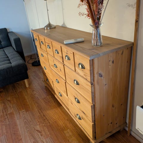 Købmandsdisk af fyr, af nyere dato. Greb af messing. H. 81, B. 132, D. 40 cm.
