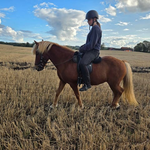 Jeg vil mene at man skal være ca 13 år + og ikke nybegynder for at ride hende, der hun ellers bare vil stå og spise på tur, man skal have kræfter til at trække hovedet op. Hun giver gerne en god lille galoptur eller tølter derudaf. Hun er 5 gænger og vælger tølten først. Hun har tidligere været redet af en 70 årig samt 2 pige parter på 13.
