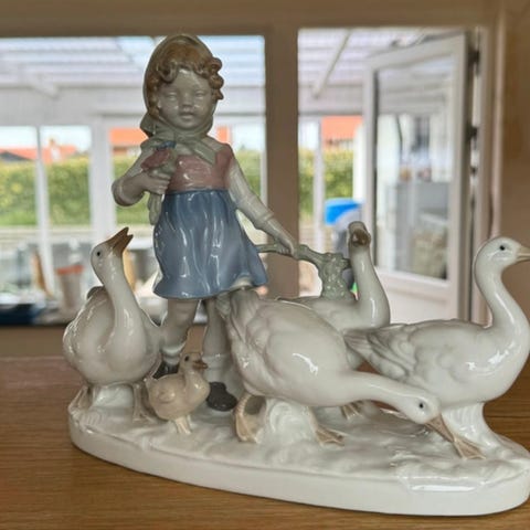 Porcelænsfigur med to engle, der står på en guldkugle.