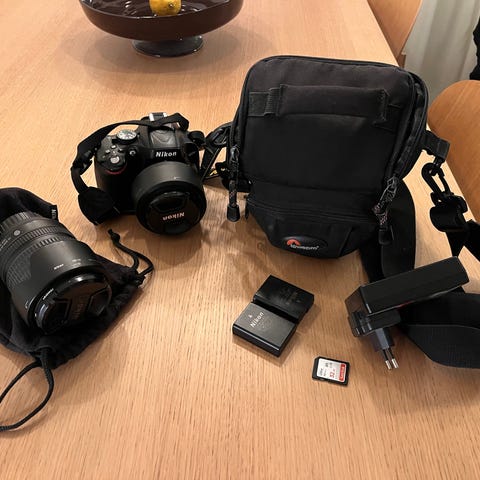 Nikon D3200 digitalkamera med medfølgende objektiv, kamerarem, batterioplader, kamerataske og kabler. Kameraet har en sort farve og er designet til fotografering med udskifteligt objektiv. Velegnet til både amatører og mere erfarne brugere.