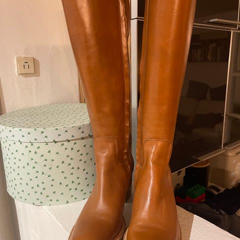 Langskaftet støvle i læder. Støvlen har en rund snude, et tætsiddende, knæhøjt skaft med funktionel sort elastikkile og lynlåslukning, fleksibel sort gummi tracksål, der går op over snude og hæl, præget logo ved hælparti, vatteret indersål, læderfoer og er udformet i naturligt og åndbart skind.
