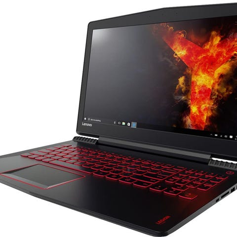 Lenovo Legion bærbar computer i sort farve. Computeren har et tastatur med numerisk blok og en skærm med tynde kanter. Den leveres med strømforsyning og tilhørende kabler. Designet til brug som bærbar arbejds- og gaming-enhed.