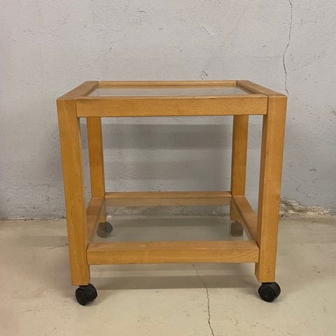 Retro sidebord / sofabord i bøg med magasinholder i hør