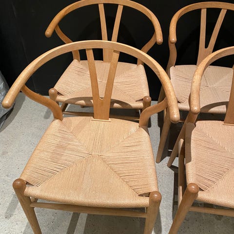 Har desværre de klassiske mærker fra bordet på armlænene. Men der kan købes maling, så det kan dækkes.