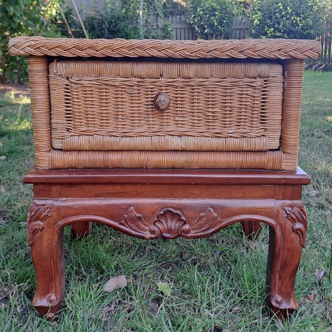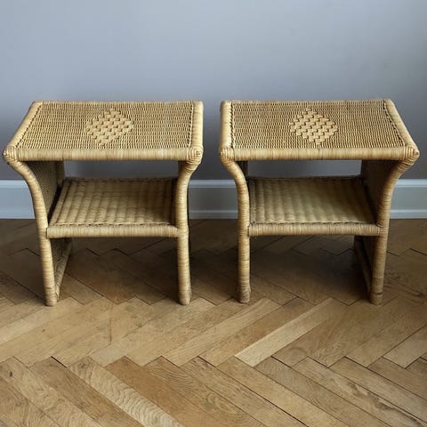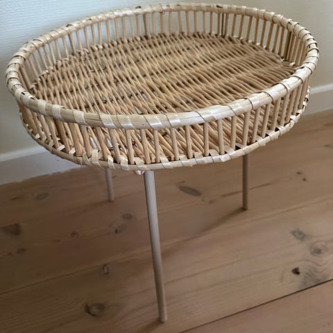 sengebord udført i naturflet med en øverste skuffe og hylde under. Designet med rundede kanter og et let, luftigt udtryk. Velegnet til opbevaring ved siden af sengen eller som et lille sidebord i hjemmet.