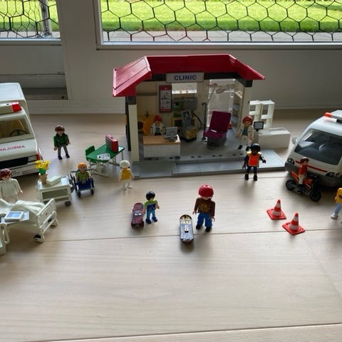 Playmobil sygehus med tilbehør, samt ambulance og rednings helikopter. Alle dele er der ikke, men der er stadig meget god leg i det. Se defekt på det ene støtteben på helikopter, som er delvist knækket, men fuld funktionalitet. Ellers pænt og fra røgfrit hjem.