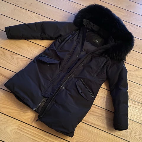 Lækker vinterdunjakke med kaninskind i hætten og vaskebjørn pelskant.