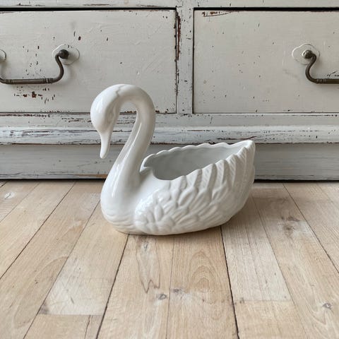 Fin hvid svaneformet vase eller urtepotteskjuler i glaseret keramik.