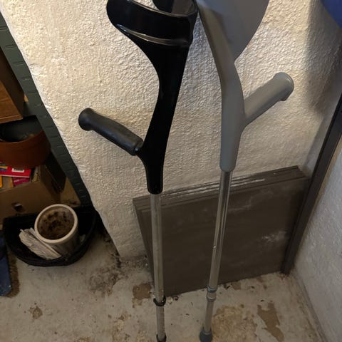 Justerbare alu krykker i metal med gummihåndtag og gummifødder. Designet til støtte og aflastning ved gang. Højden kan tilpasses efter brugerens behov.