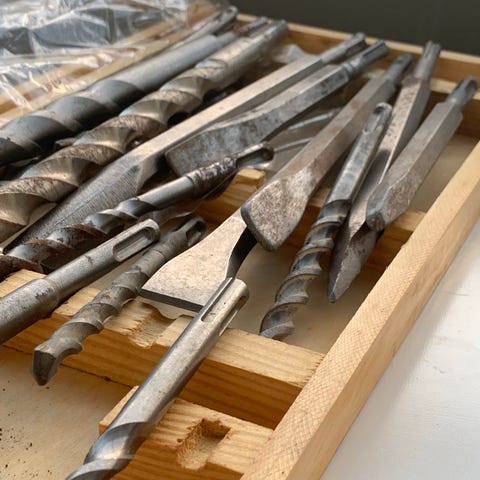 Håndboremaskine med træhåndtag og flere metalbor i forskellige størrelser. Sættet inkluderer en metalopbevaringskasse til opbevaring af boremaskine og bor. Værktøjet er velegnet til boring i træ.