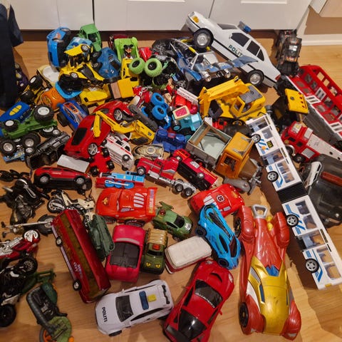 Legetøjsbiler, knap 40 år gamle, de ca. 48 helt ubrugte i to G-kolli.