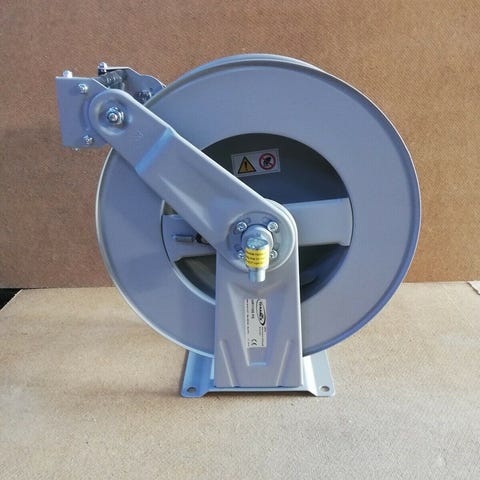 Robust boks fremstillet af grå slagfast plast (polypropylen) med drejeligt væg-/loftbeslag. Låser automatisk kablet, når det trækkes ud til den ønskede længde.