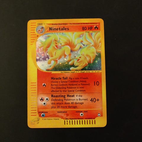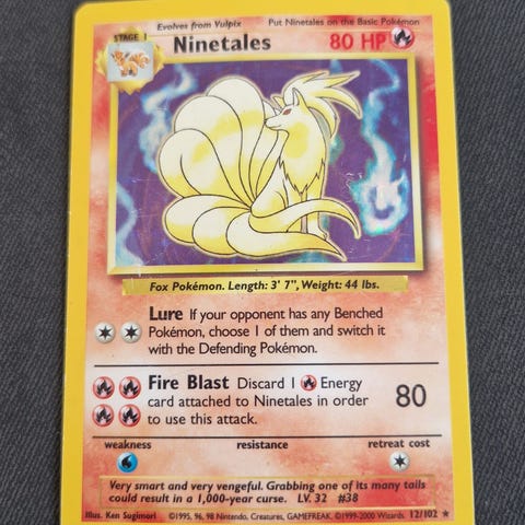 Pokémon Ninetales samlekort med illustration af Ninetales og angrebene Intense Glare og Fire Blast. Kortet er i standardstørrelse til samlekortspil.