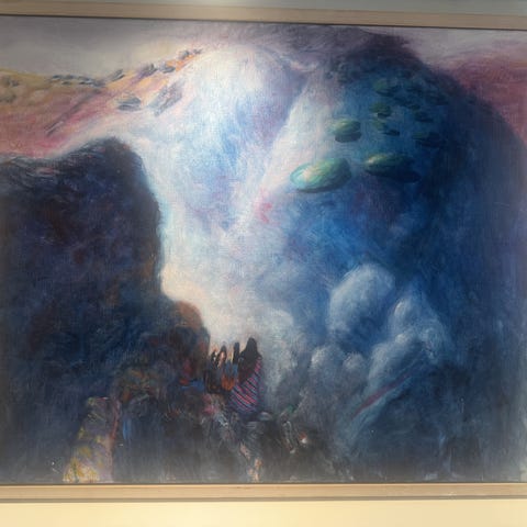 Torben Thim maleri " fra eventyrets hverdag" kaldet.Fra 1970. Indrammet med bemalet træliste.Ok stand nogle reparationer.signeret foran- og bagpå.