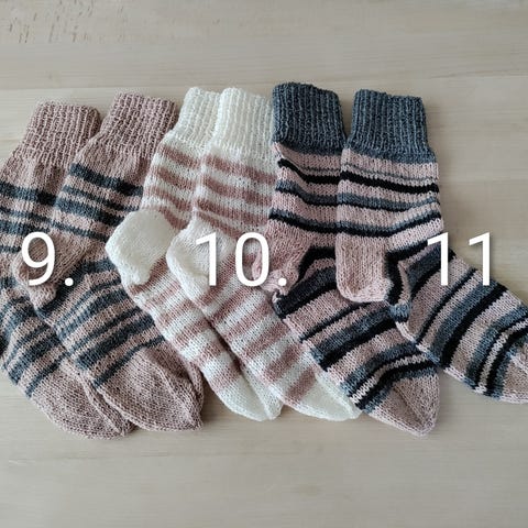 Strømper, Uld hjemmestrikkede, str. 36/37, Ubrugt, Alle par er håndstrikket i strømpegarn med uld (75%) og kan maskinvaskes på uldprogram. Passer str 36 - 37. Det er garnet (på de fleste par), der selv skifter farve. Prisen er pr par. Se også gerne mine andre annoncer (bl.a også strømper i andre størrelser).