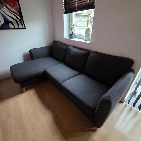 Fin mørkegrå sofa. Fin stand, men fremstår med brugsspor.