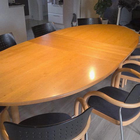 Ovalt spisebord i træ med plads til 6-8 personer. Bordet har en naturlig træfinish og en robust konstruktion, der passer til spisestuer med behov for et større bord.