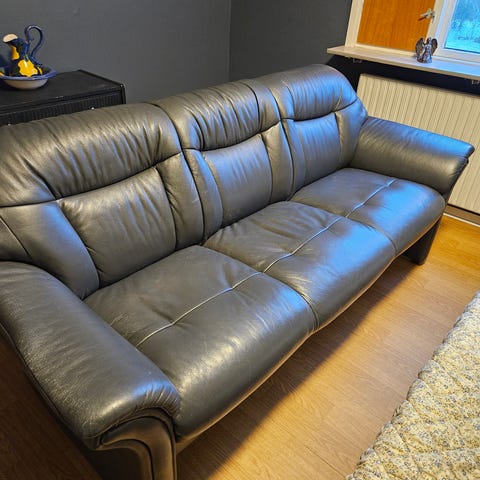 Tre personers lædersofa med puder i ægte læder og med høj siddekomfort. Velholdt med enkelt slid i kunstlæderet under puderne, som vist på billedet, men ses ikke. Fjeder og puder i god stand. Plejet med læderfedt og nem at holde rent. Fra røgfrit hjem.