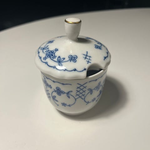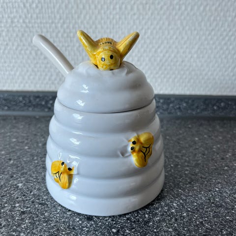 Fin og velholdt krukke, dekoreret med bier på toppen/låget og på selve krukken. Helt intakt.