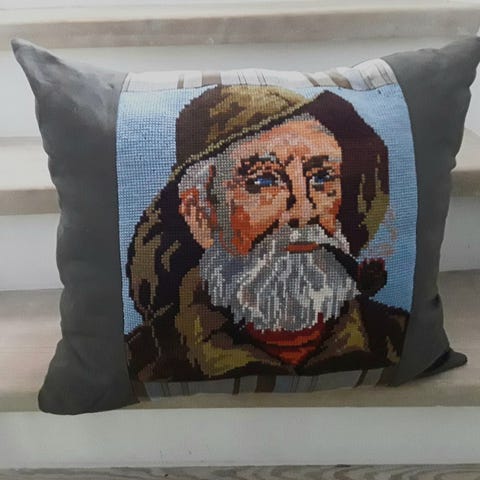 Ehrmann broderi. Monteret med sort bagside med lynlås og lilla tittekant. Som ny
