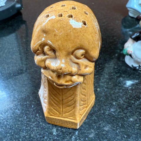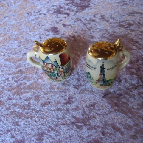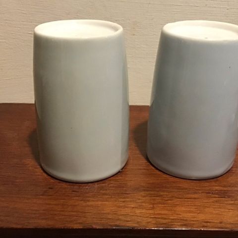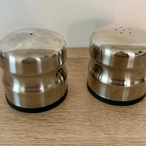 To små salt-/peberbøsse og en stor. De har stået til pynt og ikke været brugt i mange år. Samlet pris for sættet.