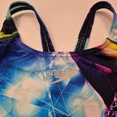 Arena badedragt i sort med grønne og pink mønstre. Badedragten har stropper og er designet til svømning. Str 6-7år