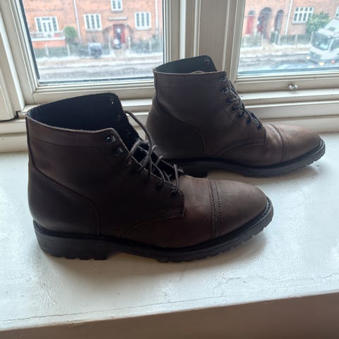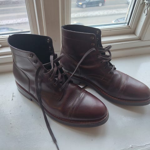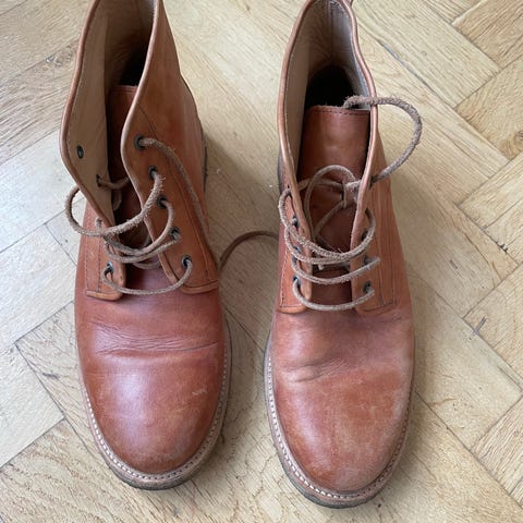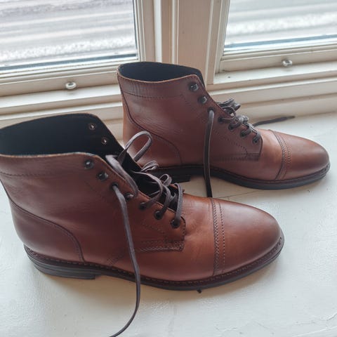 Thursday Diplomat Moc Toe læderstøvler. De er brugt få gange, så de er i rigtig fin stand. Giv dem en gang læderfedt, så er de så gode som nye. Størrelsen er 11,5 US, som svarer til ca 45 EU.