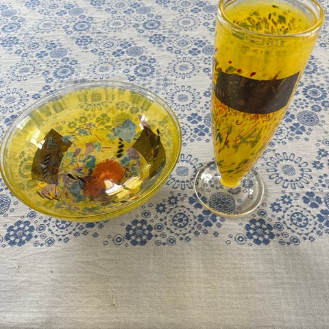 De 2 gyldne firkanter er lidt slidte og matte ellers fejler skålen intet.