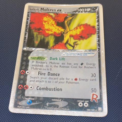 Pokémon Moltres samlekort, kortet er i sleeve og toploader