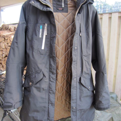 Sort jakke str 38 med mange lækre detaljer. Vand og vindtæt. Med skygge på hatten så regnen ikke render ned i ansigtet. Pæn stand, dog nogle hvide hundehår her og der. Eneste lille fejl er at en af de to snore bagpå mangler en lille læderlap (se billede). Har ingen funktionel betydning. Røgfrit hjem.
