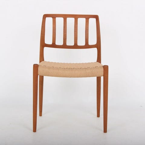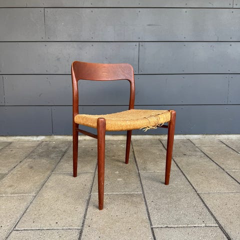 N. O. Møller stol model 75. Af teaktræ og med nyt flet.